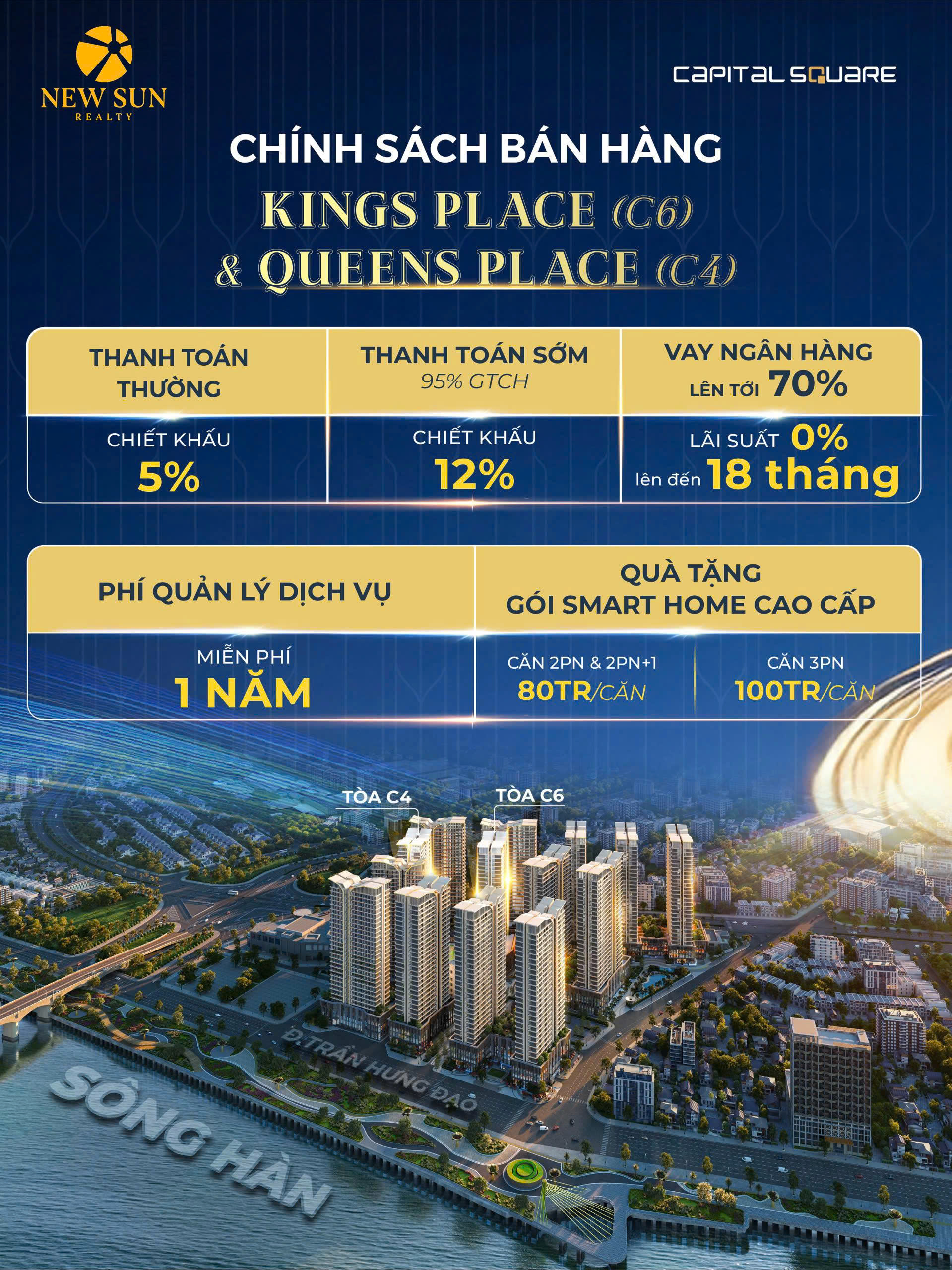 Lấy cảm hứng từ ngôn ngữ thiết kế hiện đại và tinh tế, mỗi căn hộ tại Capital Square mở ra tầm nhìn panorama khoáng đạt hướng sông Hàn, biển Mỹ Khê và trung tâm thành phố. Từ ban công riêng tư, cư dân có thể tận hưởng trọn vẹn sự giao hòa giữa thiên nhiên và nhịp sống đô thị sôi động – nơi mỗi ngày đều là một trải nghiệm sống khác biệt.