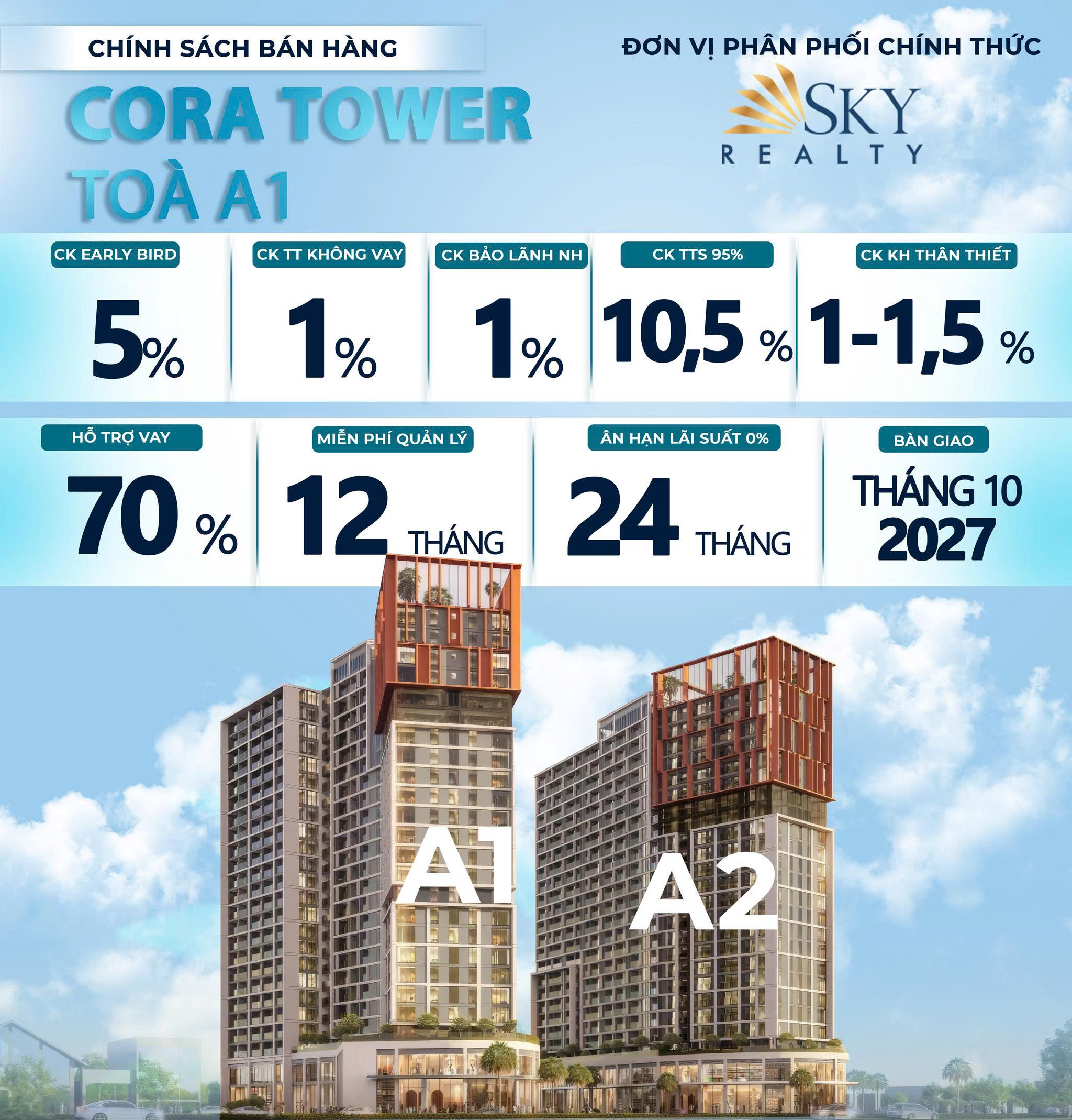 Sun Cora Tower Đà Nẵng áp dụng chính sách thanh toán linh hoạt, giúp khách hàng dễ dàng chủ động dòng tiền khi sở hữu căn hộ. Chỉ với mức đặt cọc ban đầu hợp lý, khách hàng có thể tiếp cận sản phẩm và hoàn tất các đợt thanh toán theo tiến độ rõ ràng, có hỗ trợ từ ngân hàng.